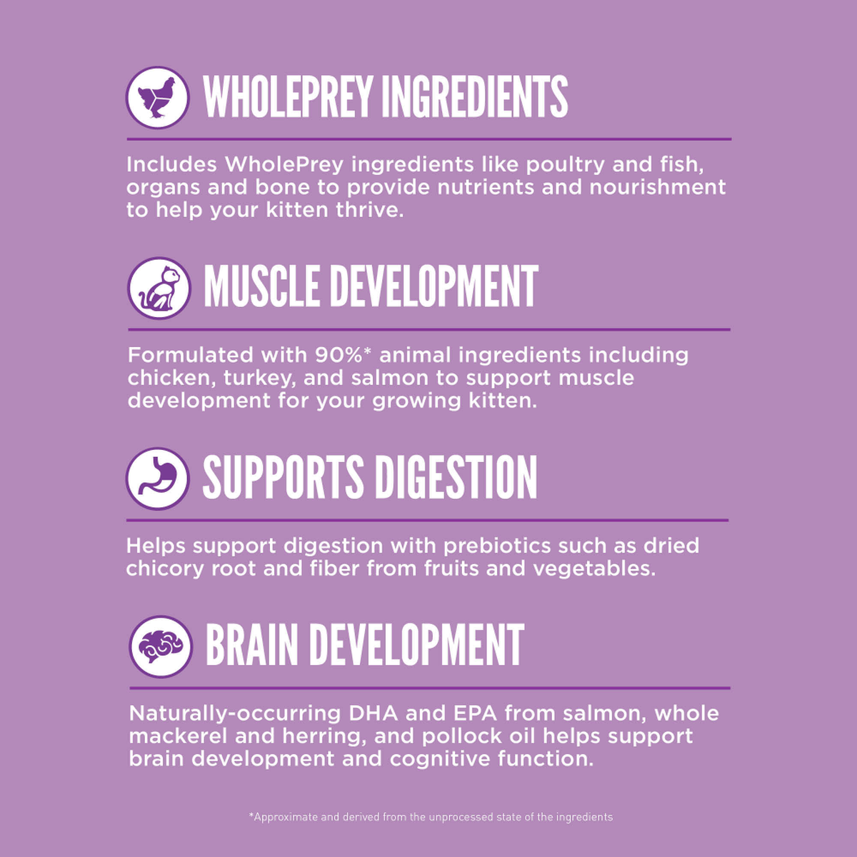 - Helps support your kitten’s digestion with prebiotics such as dried chicory root and natural sources of fiber from whole pumpkin, collard greens, whole apples & whole pears.
