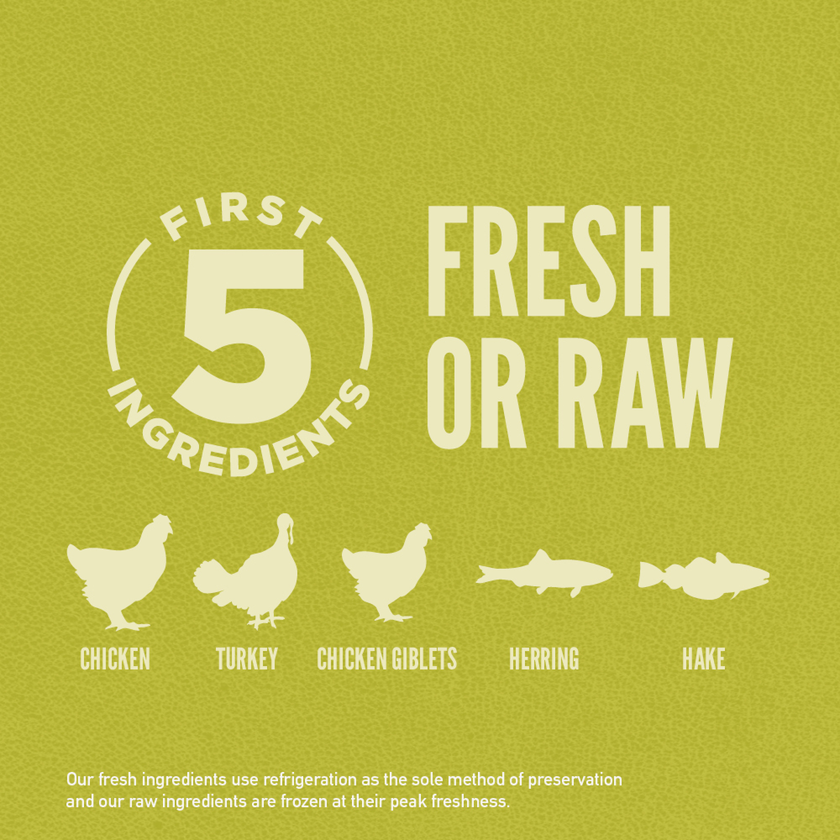 Fresh chicken (18%), raw turkey (10%), fresh chicken giblets (liver, heart) (10%), raw whole herring (6%), raw whole hake (5%), fresh eggs (5%), raw turkey liver (5%), dehydrated chicken (5%), dehydrated turkey (5%), dehydrated mackerel (4%), dehydrated sardine (4%), dehydrated herring (4%), whole red lentils, whole green lentils, whole peas, lentil fibre, whole chickpeas, whole pinto beans, pea starch, pollock oil (2%), chicken fat (2%), whole navy beans, dried kelp, fresh whole pumpkin, fresh whole butternut squash, fresh whole zucchini, fresh whole carrots, fresh whole apples, fresh whole pears, dried chicory root, fresh kale, fresh spinach, fresh beet greens, fresh turnip greens, whole cranberries, whole blueberries, whole saskatoon berries, turmeric, milk thistle, burdock root, lavender, marshmallow root, rosehips.