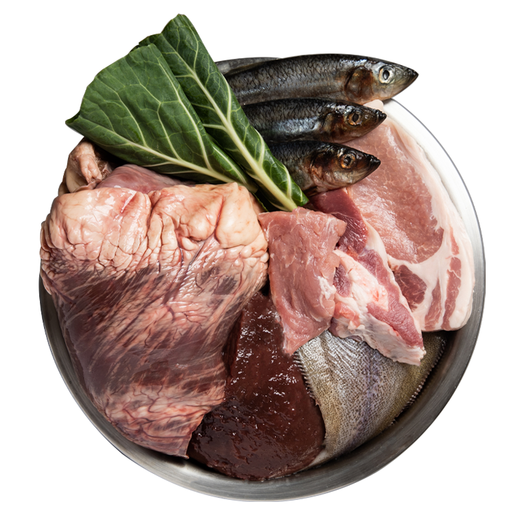 Beef, beef liver, lamb, wild boar, flounder, pork, beef tripe, pork liver, whole herring, lamb liver, pea fiber, bison, lamb tripe, lamb kidney, whole pumpkin, collard greens, whole apples, whole carrots, whole pears, calcium carbonate, bison kidney, bison liver, bison tripe, salt, dried kelp, choline chloride, zinc proteinate, manganese proteinate, copper proteinate, calcium pantothenate, vitamin E supplement, mixed tocopherols (preservative), riboflavin, folic acid, thiamine mononitrate, pyridoxine hydrochloride, rosemary extract, citric acid (preservative).