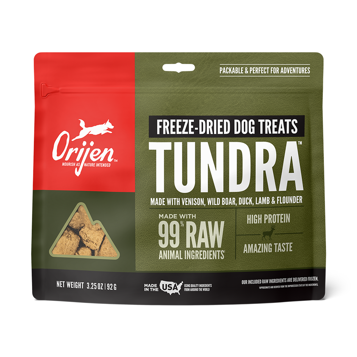 Treat your dog to delicious and nutritious ORIJEN® Freeze-Dried Treats. Packed with animal protein, our Tundra Recipe is made with 99%* animal ingredients including nourishing venison, wild boar, duck, lamb and flounder. Freeze-dried to lock in their rich nutrients and flavor, they’re packable and perfect for adventures. At just five calories each, ORIJEN Freeze-Dried Treats are loaded with protein and amazing taste.